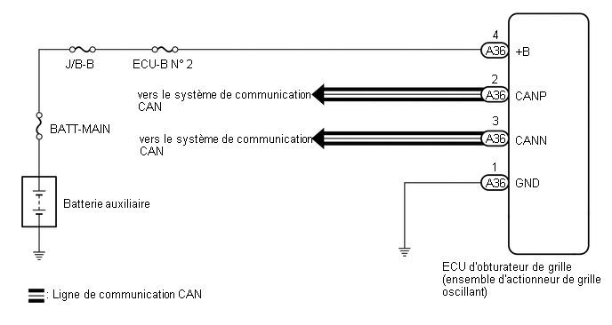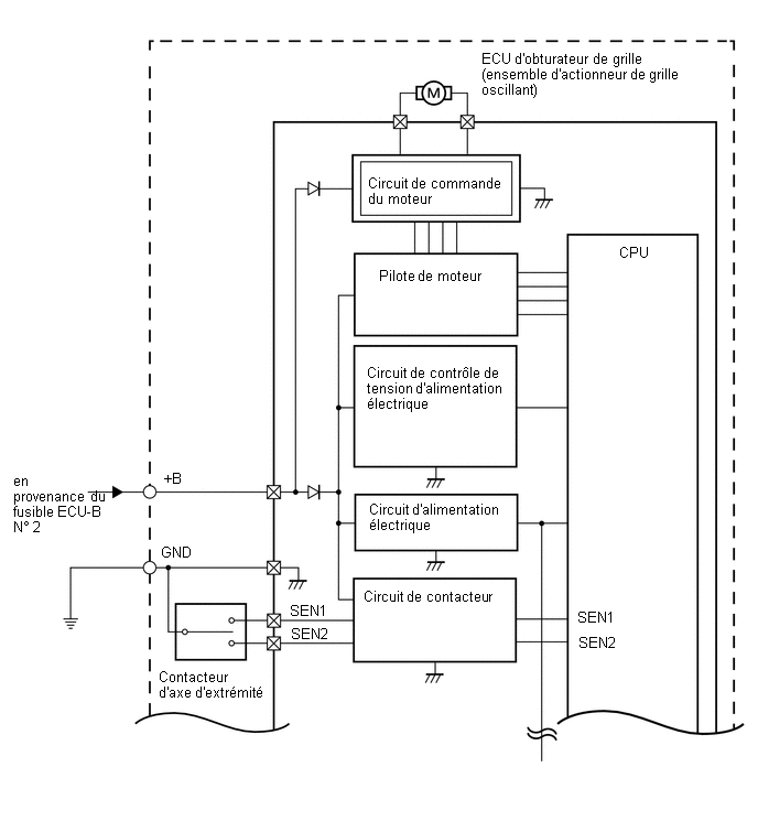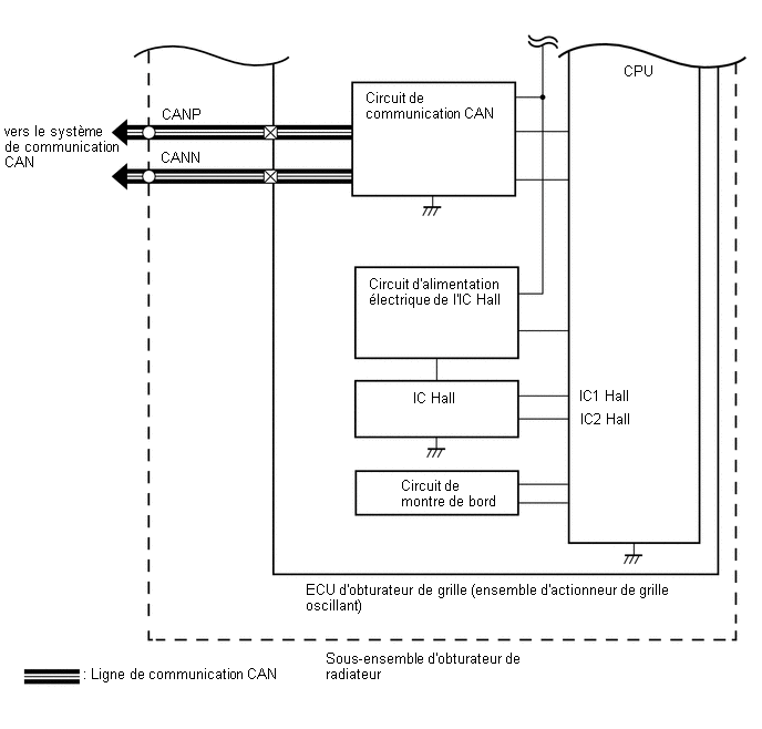 Si l'ECU d'obturateur de calandre (ensemble d'actionneur de grille oscillant) détecte que l'obturateur de calandre s'est arrêté pendant l'opération d'ouverture ou de fermeture, en raison de corps étrangers ou d'un dysfonctionnement, il transmettra un signal de dysfonctionnement à l'ECM, et l'ECM enregistre un DTC.