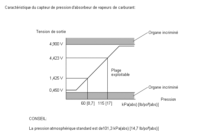 Si la tension de sortie du capteur de pression de l'absorbeur de vapeurs de carburant (pression) est supérieure à 4,9 V: 123,76147 kPa(abs) [17,94541 lb/po²(abs)], l'ECM considère qu'il y a coupure ou court-circuit dans le capteur de pression d'absorbeur de vapeurs de carburant ou son circuit, et il arrête le contrôle du système EVAP. Si une quelconque détérioration apparaît, l'ECM allume le MIL et enregistre le DTC (logique de détection à 1 cycle (s)).