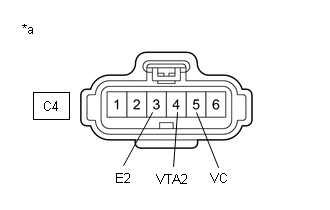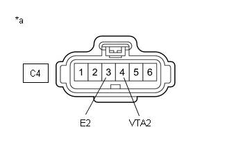 Si la tension de la borne VTA2 ou la résistance entre les bornes VTA2 et E2 est anormale et que les bornes 3 (E2) et 4 (VTA2) du connecteur de l'ensemble de corps de la valve d'accélérateur sont branchées, il se peut qu'un excès de courant traverse le circuit. Dans ce cas, ne pas brancher les bornes.
