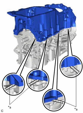 | (b) Introduire la lame d'un coupoir de joint de carter d'huile entre l'ensemble de carter de renforcement et le sous-ensemble de carter d'huile n° 2. Couper le produit d'étanchéité appliqué et déposer le sous-ensemble de carter d'huile n° 2. REMARQUE: