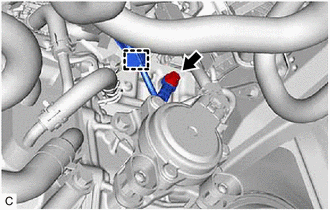 | (a) Faire coulisser l'agrafe et débrancher la durite de radiateur n° 2 du sous-ensemble d'entrée d'eau. |