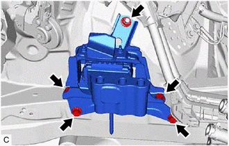 | (d) Déposer les 3 boulons et l'écrou et détacher le silentbloc de support du moteur gauche de l'ensemble de boîte-pont de véhicule hybride. |