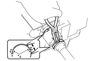 | (b) A l'aide d'une pince pour pompe à eau, pincer l'attache de soufflet de joint intérieur d'essieu avant pour la fixer provisoirement, jusqu'à ce qu'un déclic se fasse entendre. REMARQUE: Veiller à ne pas endommager le soufflet du joint intérieur de l'essieu avant. |