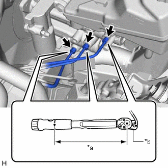 | (b) A l'aide d'une clé à écrou de raccord, brancher les 3 canalisations de frein sur l'ensemble de servofrein avec maître-cylindre. Torque: Couple de serrage prescrit : 15,2 N·m {155 kgf·cm, 11 ft·lbf} REMARQUE: