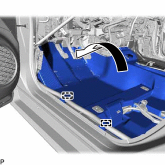 | (e) Reposer le tapis de sol avant dans sa position d'origine comme indiqué sur le schéma. |
