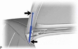 | (a) Engager les 2 joints à rotule pour reposer l'ensemble de béquille de porte de coffre. REMARQUE: Reposer l'ensemble de béquille de porte de coffre tout en soutenant la porte de coffre avec les mains. |