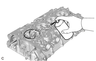 | (a) A l'aide d'un colorant de vérification, rechercher toute fissure éventuelle sur les conduits d'admission, les conduits d'échappement et la surface inférieure du sous-ensemble de culasse. CONSEIL: Si des fissures sont décelées, remplacer le sous-ensemble de culasse. |